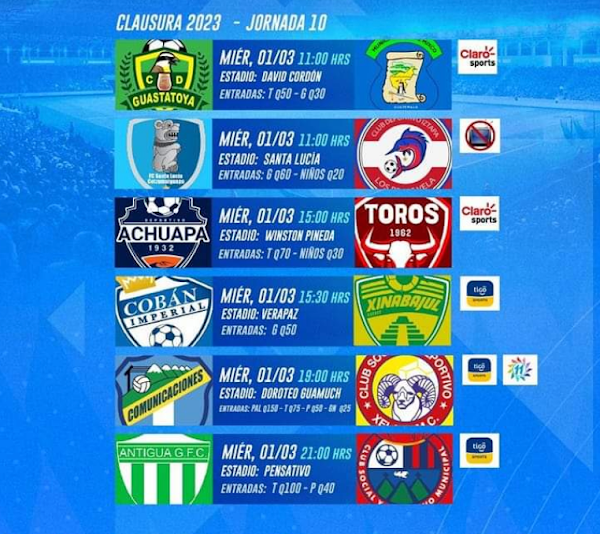 Derechos de Transmisión Albavisión Comunicaciones FC Club Social y Deportivo Municipal Tigo Antigua Guatemala FC Club Deportivo Cobán Imperial Comunicaciones FC Club Social y Deportivo Municipal CSD Xelajú Mario Camposeco Deportivo Xinabajul Claro Sports Deportivo Mixco Club Deportivo Malacateco Club Deportivo Guastatoya Club Social y Deportivo Zacapa Deportivo Achuapa Coatevisión Coatepeque Fútbol Club